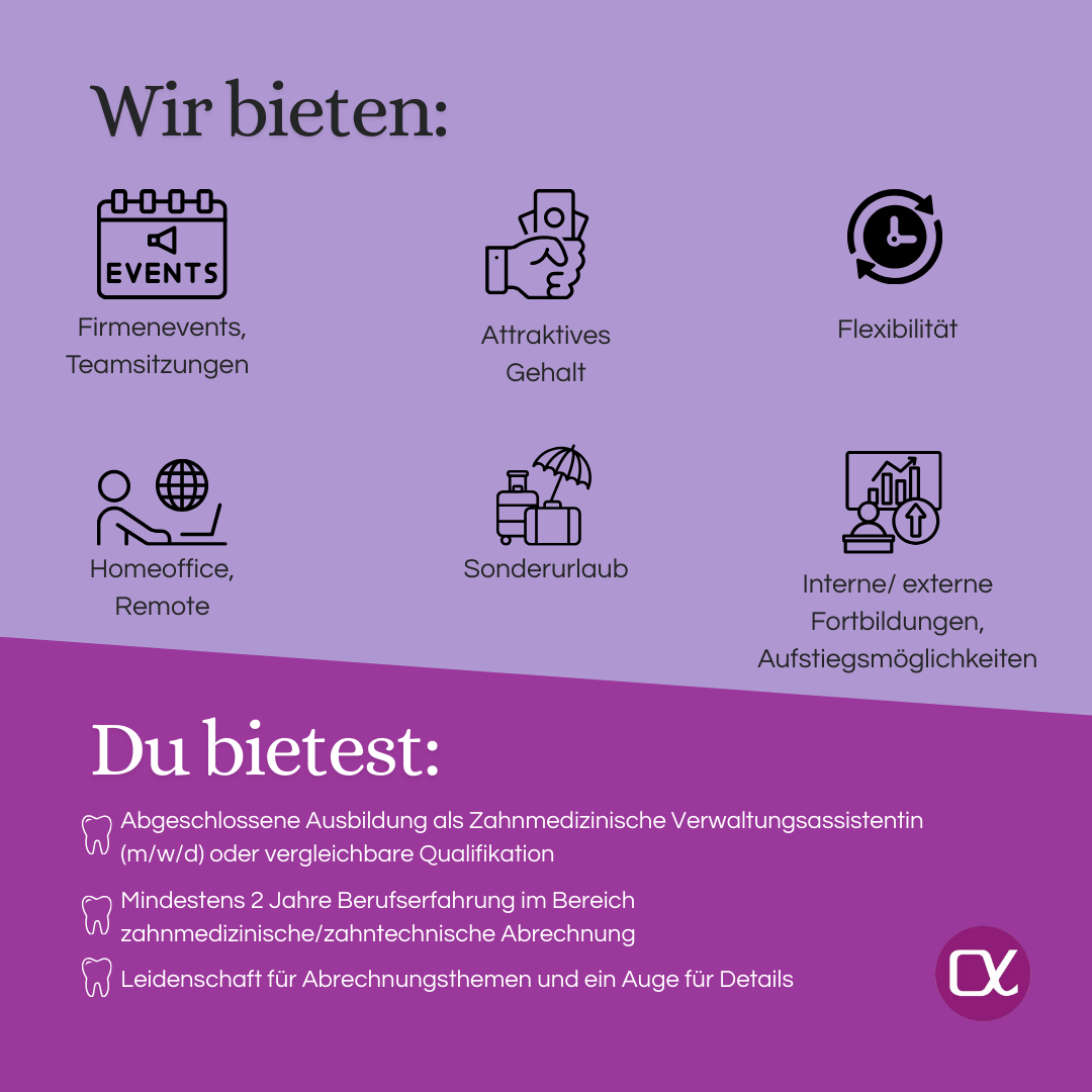 - Mindestens 2 Jahre Berufserfahrung in der zahnärztlichen/zahntechnischen Abrechnung