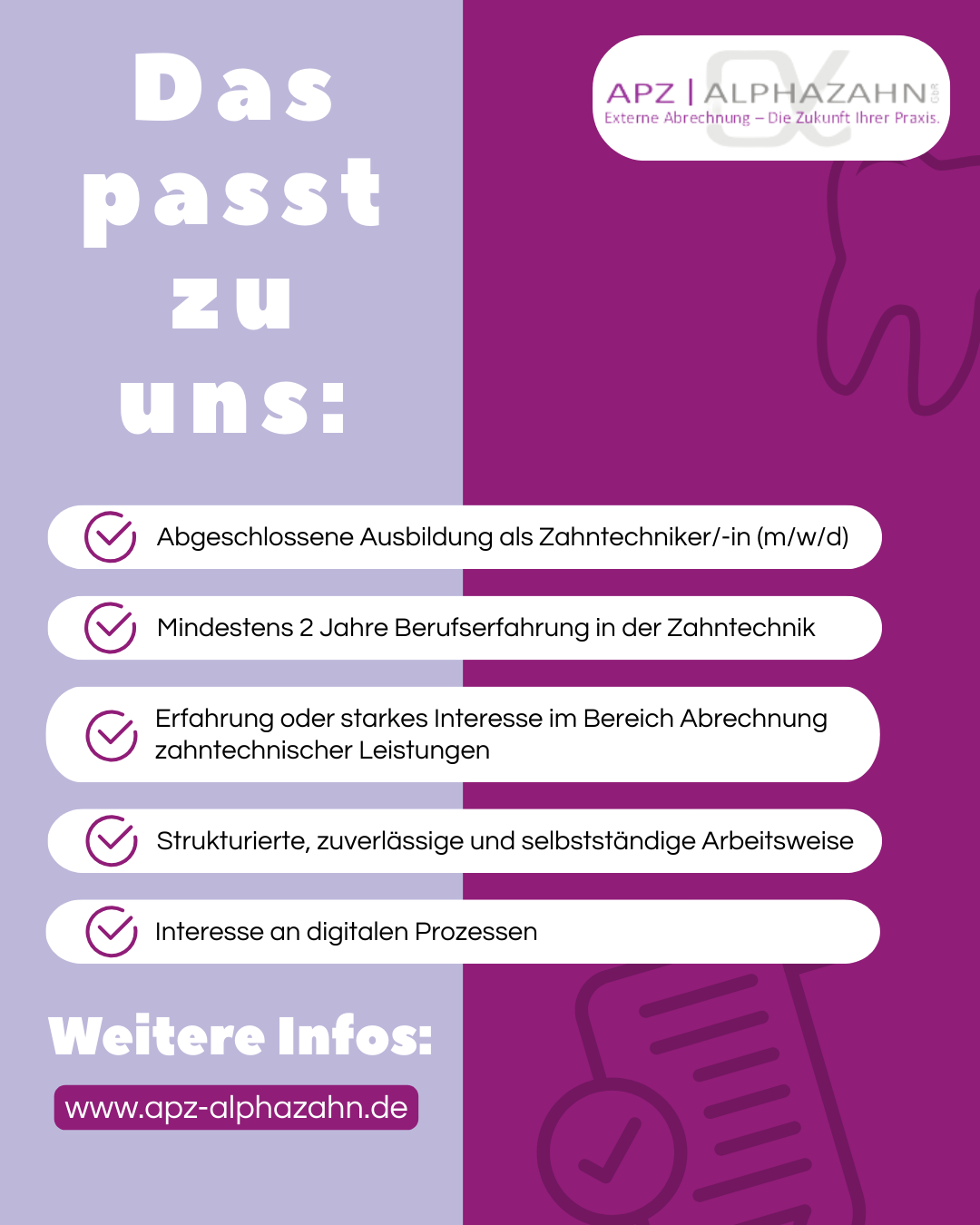 Zahntechniker/-in (m/w/d) für die zahntechnische Abrechnung gesucht – Werde Teil unseres Teams bei APZ | Alphazahn!